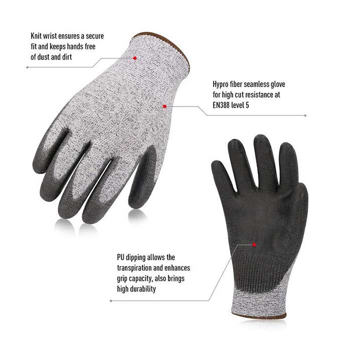 HPPE nitrile coated cut resistant gloves are manufactured from HPPE yarn and coated with nitrile. HPPE, posses level 5 cut resistance with excellent abrasion resistance. Nitrile coating provides excellent grip and is resistant to snags and abrasions. Smooth finish provides more flexibility. Seamless knit gloves provide great dexterity and flexibility. These gloves are the perfect choice for auto repair, tools, logistic, construction, glass industry, mechanical operation, hardware, security, etc..