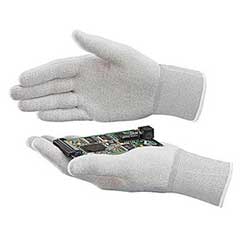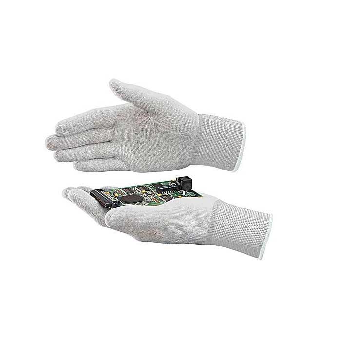 These antistatic gloves are made of seamless knit polyester or nylon and carbon fiber yarns. The surface resistivity is 10e6-10e8. Static dissipative fiber yarns blended with low lint polyester or nylon which reduces static build-up on the glove surface for improved performance in electronics assembly. Seamless knitted gloves provide great dexterity. These gloves are ambidextrous which allows flexibility and reduces fatigue and are washable.