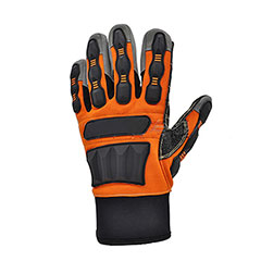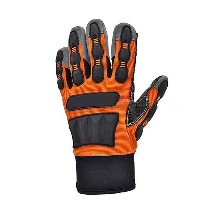 High-Visibility Impact Gloves - touchscreen compatible are manufactured from comfort-enhancing spandex at back and synthetic leather at palm. TPR reinforced knuckles, fingers and back of hand. Synthetic leather at palm sewed with aramid thread provide good abration and better grip. Reinforced thumb crotch add toughness. Velvet lining keep hands warm. These gloves are used widely in oil production, petrochemical industry, mining industry, machinery…etc.