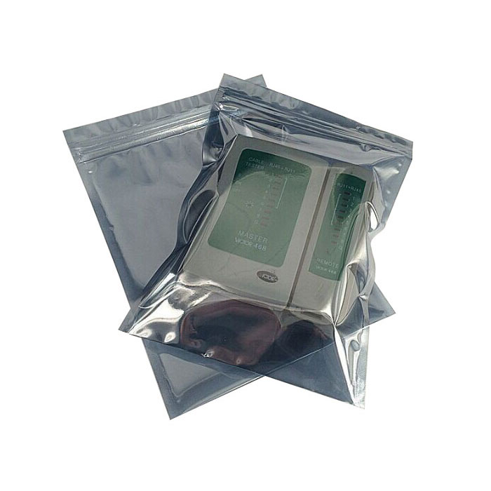 ESD Shielding Bags are made of a multi-layer 3mil (0.075mm) or 5.5mil (0.14mm) laminated film which has a metal layer as its core. This layer functions as a barrier to E.S.D which allows a charge to move around and not through the bag. The inner layer provides static dissipative protection for the metal layer and also strengthens seal of bag. The outer layer is a non-static generating layer that resists abrasion and puncture.